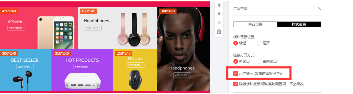 模板里需自定义传图的地方均有尺寸提示开关。设置的位置见下图。