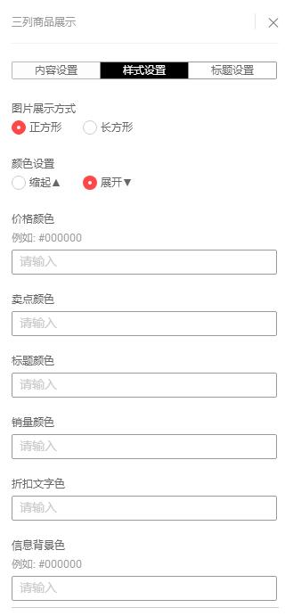 装修模块中商品模块的标题,价格,折扣价,卖点等信息的颜色均可修改。颜色代码统一用RGB代码。
