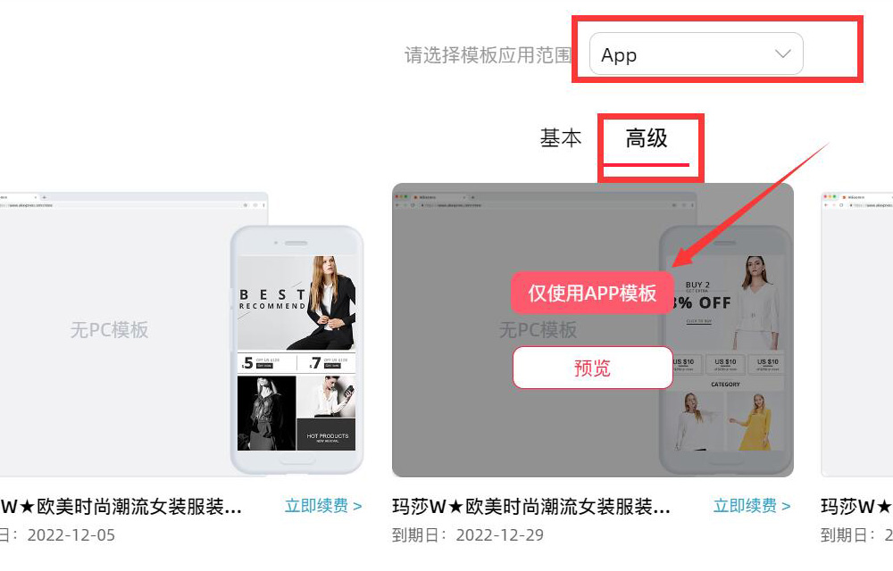 6. 模板应用范围选 「APP」再点击 「高级」再点击 「使用APP模板」