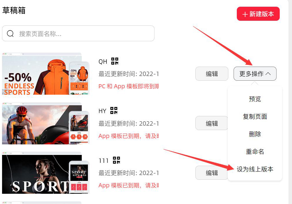 10. 如果装修好的页面不是首页,点击 「更多操作」 ,点击 「设为线上版本」即可生效