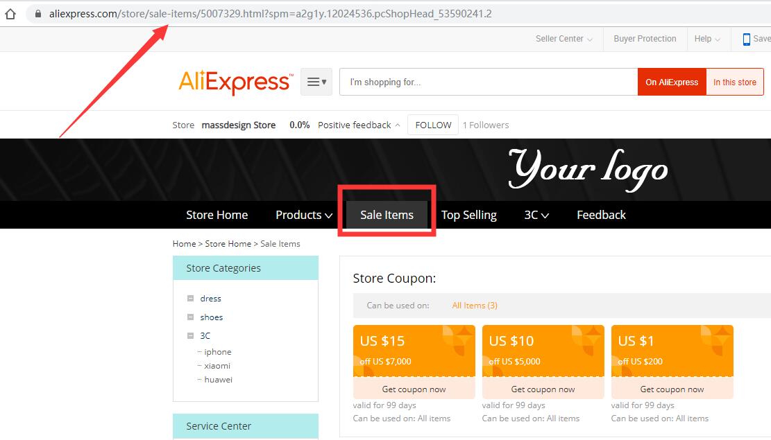就是点开你店铺导航上Sale Items 打开后的网页地址。关于无线端优惠券模块,优惠券的链接无需设置。顶部自动显示创建好的优惠券。