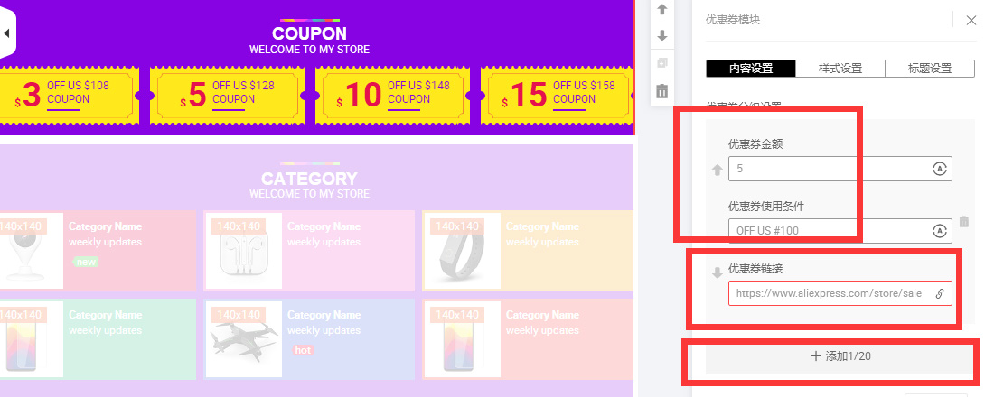 关于PC端优惠券模块,优惠券的金额,使用条件可以自己手动填写,速卖通优惠券的链接统一都是一个,